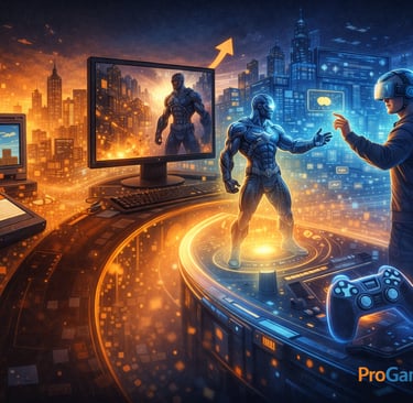 A ilustração sintetiza visualmente o amadurecimento dos jogos baseados em quadrinhos como uma mídia narrativa autônoma e estratégica dentro da indústria de videogames. A composição integra símbolos de diferentes eras tecnológicas — desde interfaces e dispositivos rudimentares até ambientes digitais avançados e experiências imersivas — conectados por uma progressão visual contínua que representa a evolução histórica, cultural e técnica do gênero. O objetivo da imagem é reforçar a ideia de que os jogos inspirados em quadrinhos deixaram de ser adaptações secundárias para se tornarem plataformas centrais de construção narrativa, identidade cultural e inovação tecnológica no entretenimento digital contemporâneo.